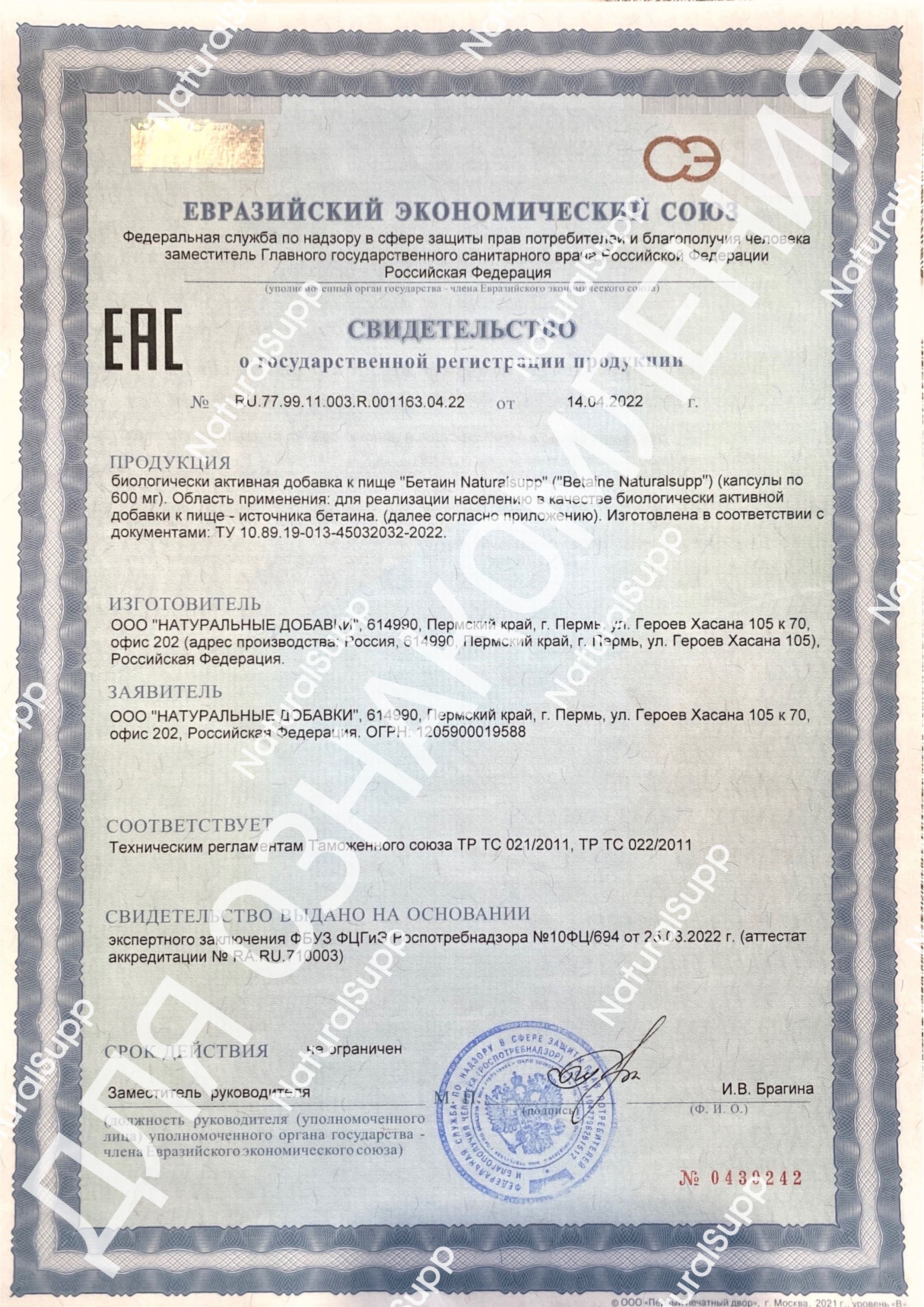 Бетаин способствует выработке глутатиона, который обладает мощным антиоксидантным действием. Бетаин обладает гепатопротекторным свойством, способствует выведению из организма токсических веществ, заживлению тканей, очищает сосуды, улучшает функции печени, благотворно воздействует на метаболизм в целом.