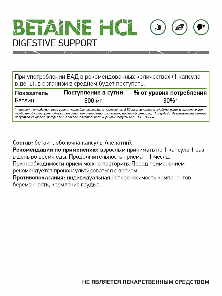 Бетаин HCL помогает желудку расщеплять жиры и белки, поступающие с пищей. Он является важным компонентом для метаболизма и переваривания пищи, и особенно необходим для усвоения белков, витамина В12, кальция и железа. Бетаин также способствует процессу детоксикации в организме.