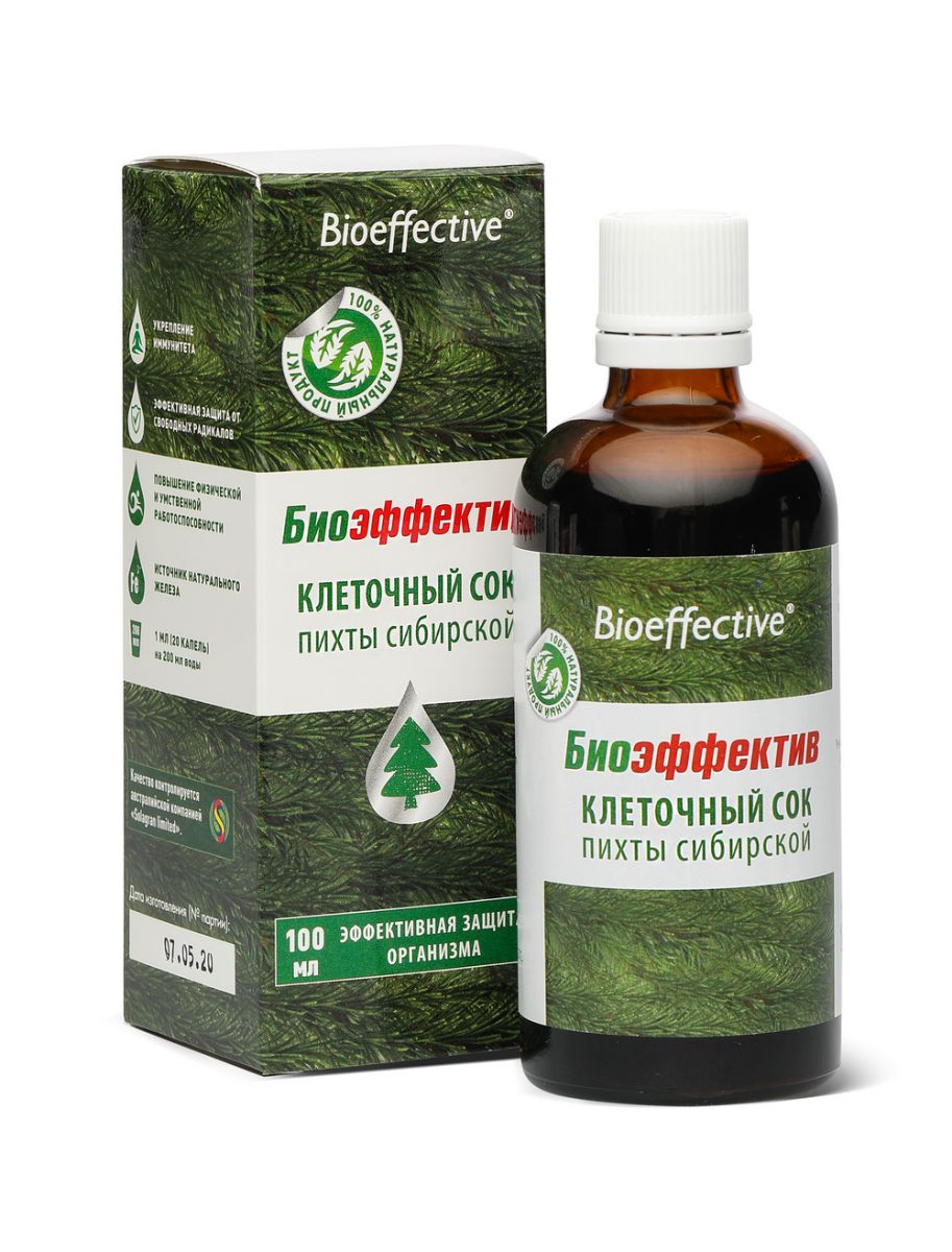 «Биоэффектив Клеточный сок пихты сибирской», полученный по оригинальной запатентованной технологии, представляет собой нативный клеточный сок свежезаготовленной древесной зелени пихты сибирской (Abiessibiricus).