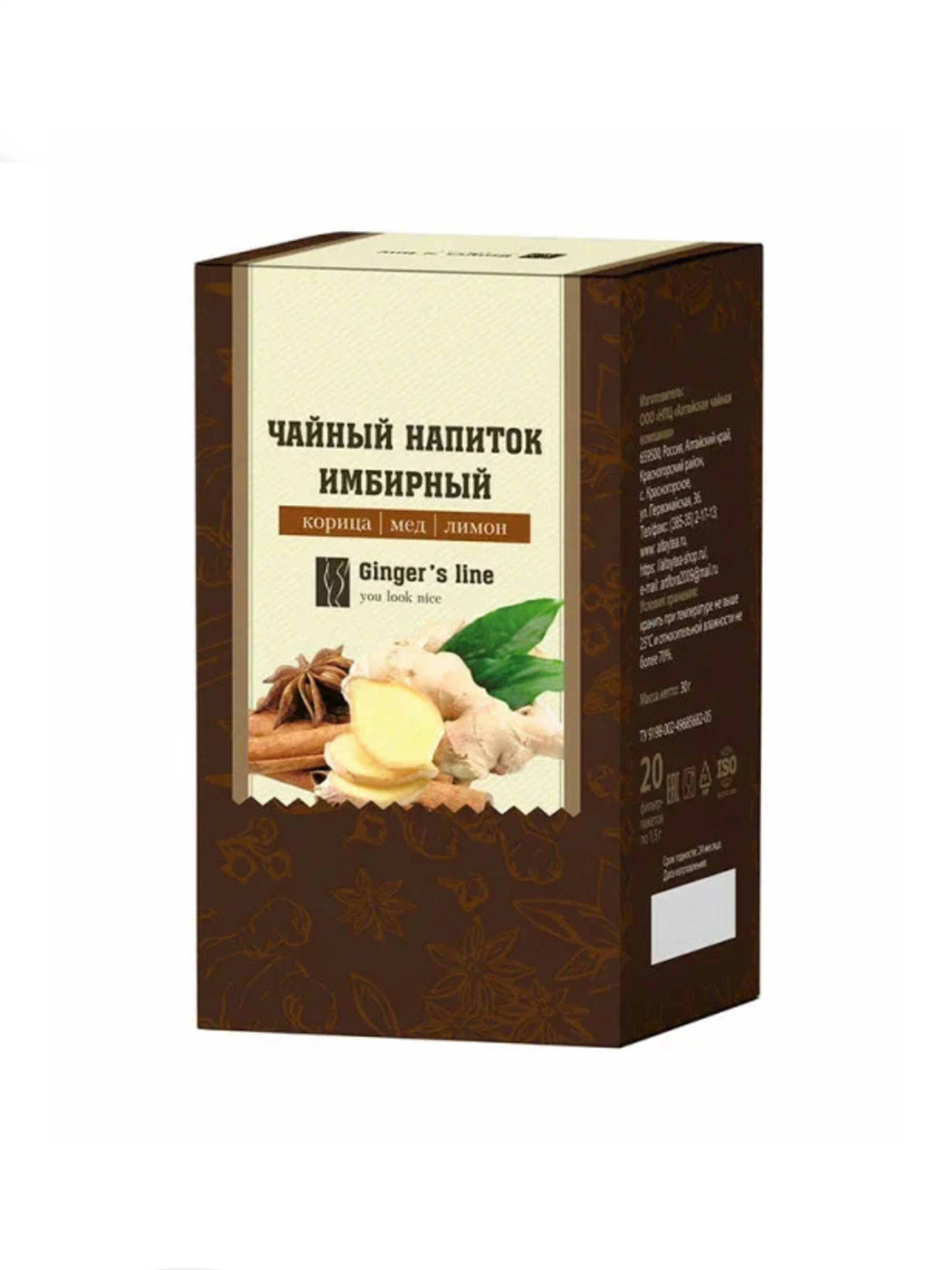 Резкость имбиря становится мягче, благодаря добавлению душицы, зверобоя и элитного зеленого чая; медово-коричный аромат с пикантными нотками лимона делает напиток еще более оригинальным и привлекательным.