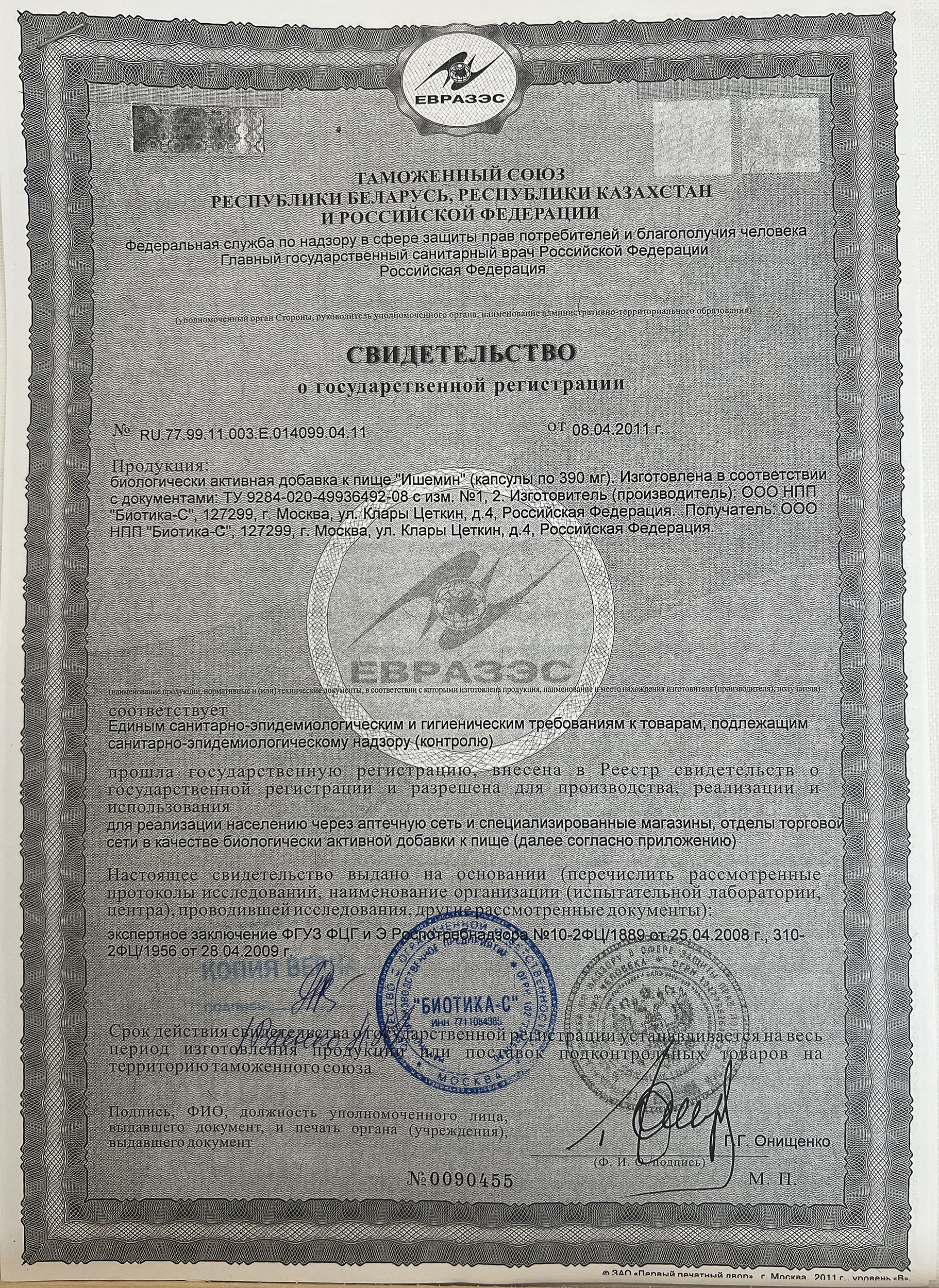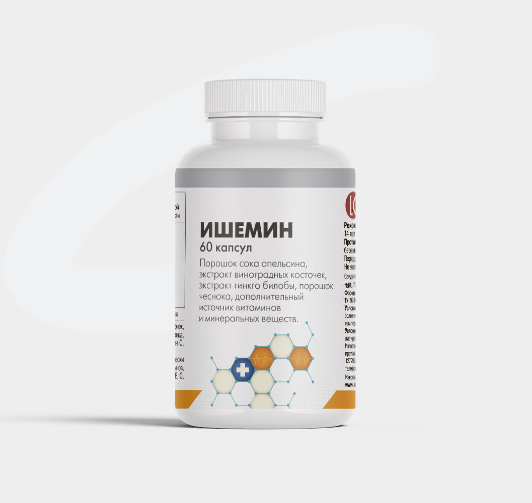 Цитрусовые биофлавоноиды, витамин С, экстракт гинкго билобы, экстракт чеснока и виноградных косточек в ИШЕМИН усилены жизненно важными витаминами А, Е и органически эссенциальными микроэлементами, в максимально усвояемой форме: селен-спирулина-С, аспарагинат марганца, аспарагинат цинка, которые значительно усиливают действие друг друга.