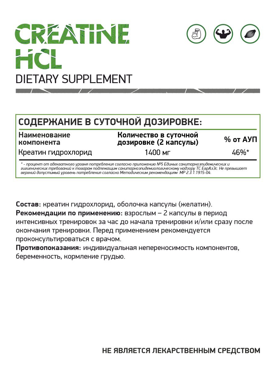 Creatine HCL - является органическим соединением, относимым к группе карбоновых кислот. Эта азотосодержащая кислота синтезируется в человеческом организме и содержится в ряде тканей, в первую очередь – в мускулах. Задача креатина сводится к поддержанию энергетического баланса, в частности внутри мышечных структур и клеток нервной системы. Креатин участвует в энергетическом обмене в мышечных и нервных клетках. Широко используется для увеличения силы, мышечной массы и кратковременной анаэробной выносливости, обладает экспериментально доказанной безопасностью. Основные эффекты креатина: увеличение силы, увеличение мышечной массы, увеличение секреции анаболических гормонов (тестостерон, соматотропин). Форма гидрохлорида рядом экспертов признается эффективнее традиционной формы моногидрата.