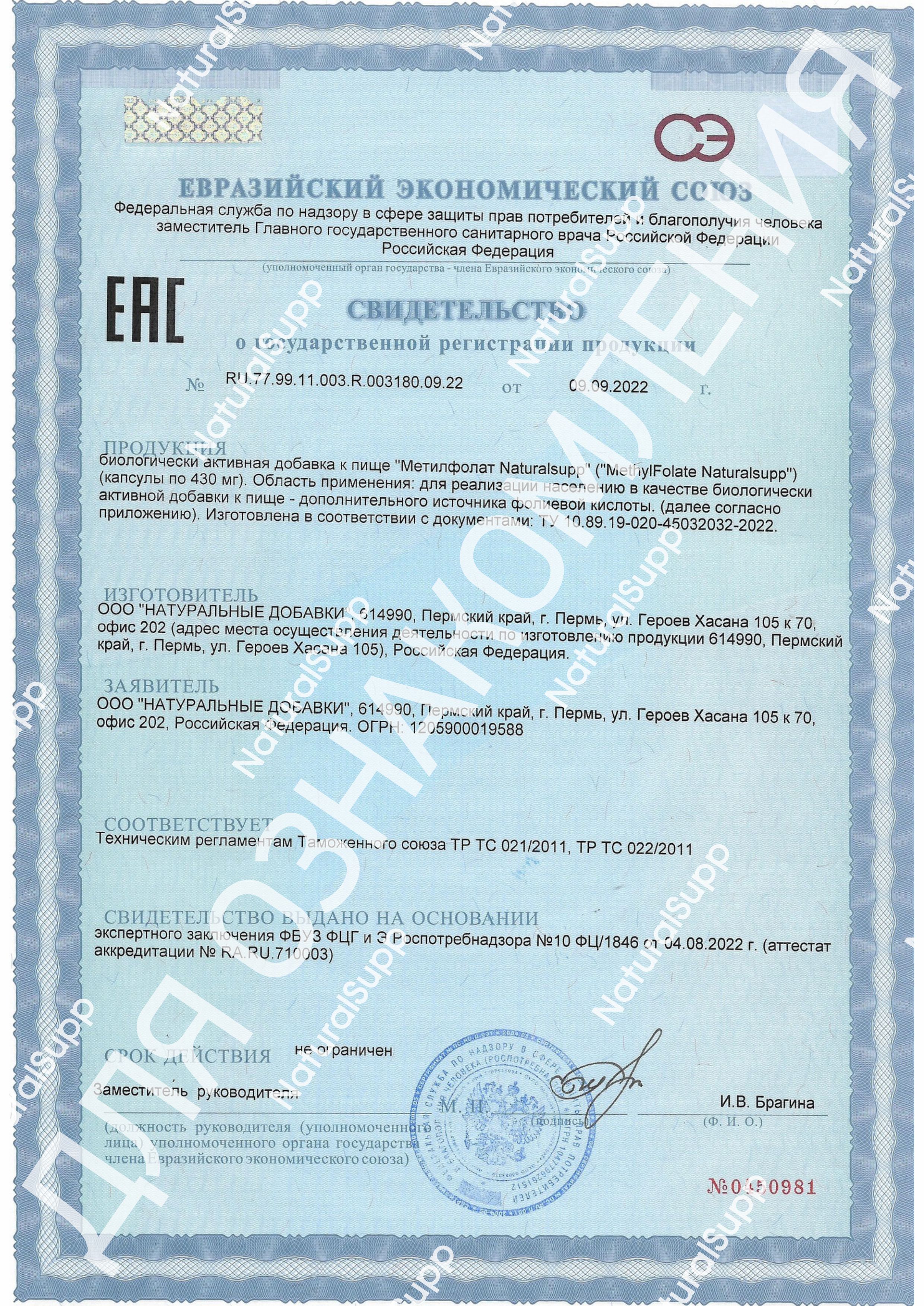 Метилфолат представляет собой биологически активную, наиболее усваиваемую форму Витамина Б9 (фолиевой кислоты). Он не синтезируется организмом, поэтому чрезвычайно важен для таких основных функций организма, как физиологическое деление и рост клеток, синтез нейротрансмиттеров и ДНК, также Метилфолат участвует в процессе образования окиси азота из аргинина.