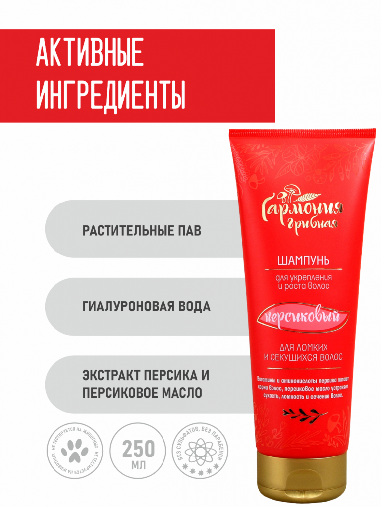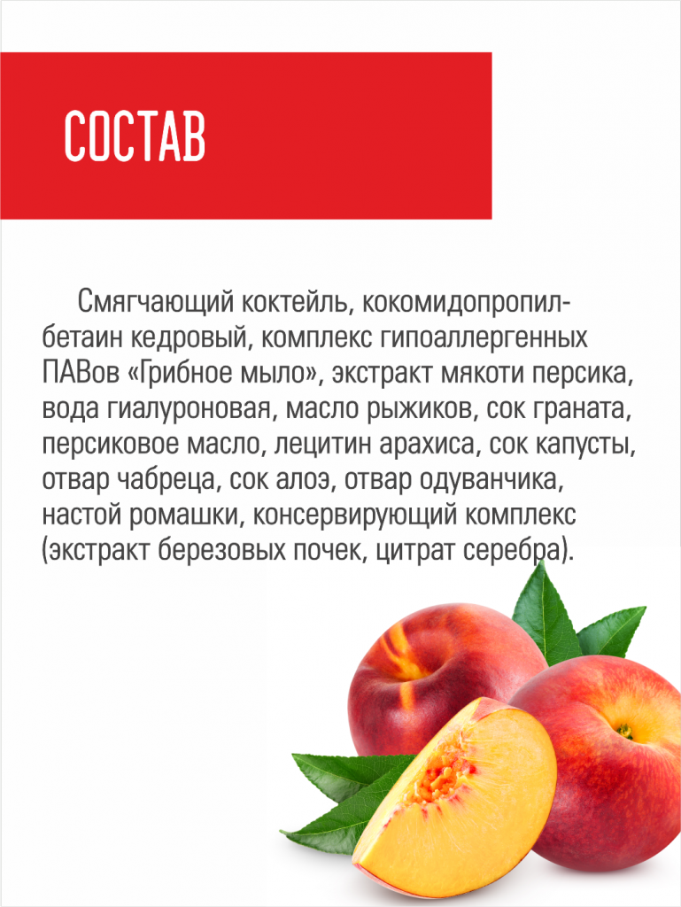 Смягчающий коктейль, кокомидопропилбетаин кедровый, комплекс гипоаллергенных ПАВов «Грибное мыло», экстракт мякоти персика, вода гиалуроновая, масло рыжиков, сок граната, персиковое масло, лецитин арахиса, сок капусты, отвар чабреца, сок алоэ, отвар одуванчика, настой ромашки, консервирующий комплекс (экстракт березовых почек, цитрат серебра).
