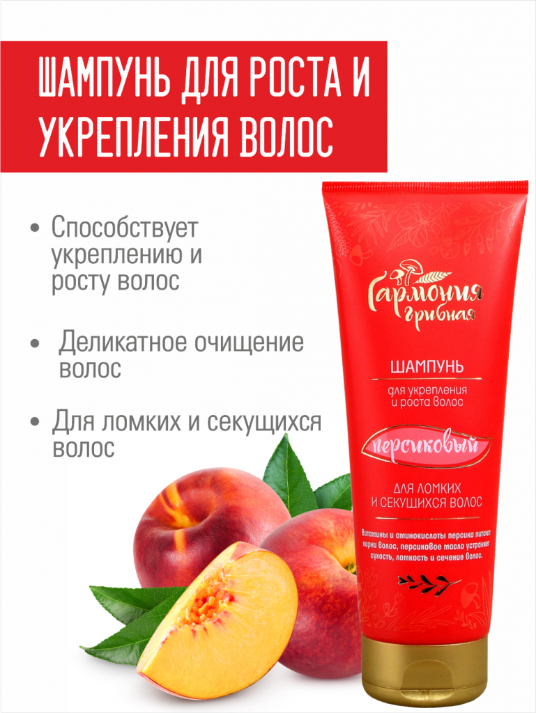Витамины и аминокислоты персика питают корни волос, персиковое масло устраняет сухость, ломкость и сечение волос. Шампунь препятствует расслаиванию волос, восстанавливает поврежденные участки. Защищает волосы и кожу головы от внешних воздействий, облегчает расчесывание.