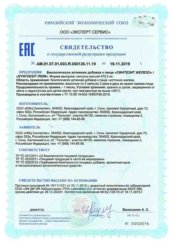 Железо (Iron citrate Synthesit): 800 мкг.