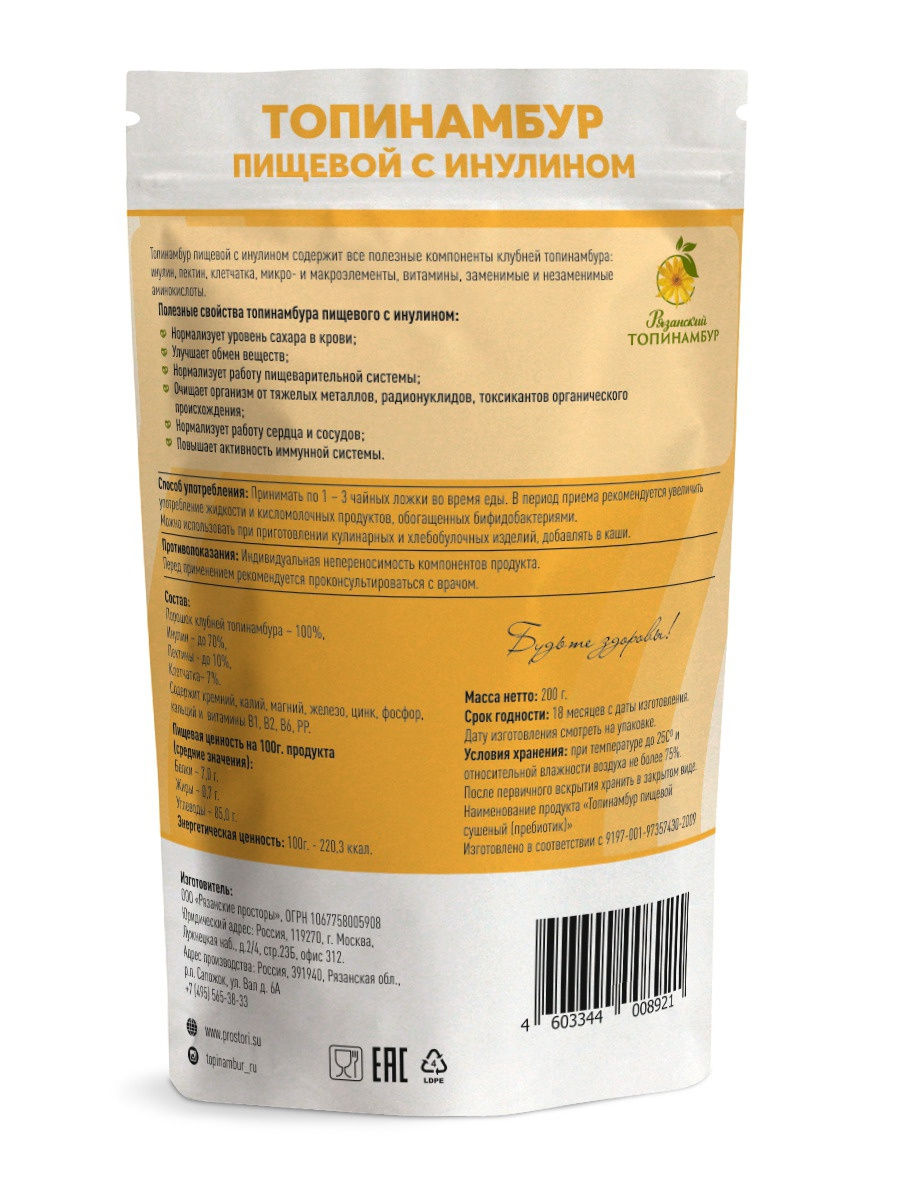 Топинамбур пищевой с инулином производится из экологически чистого сырья – клубней топинамбура. Технология производства порошка топинамбура позволяет в полной мере сохранить все полезные свойства топинамбура.
