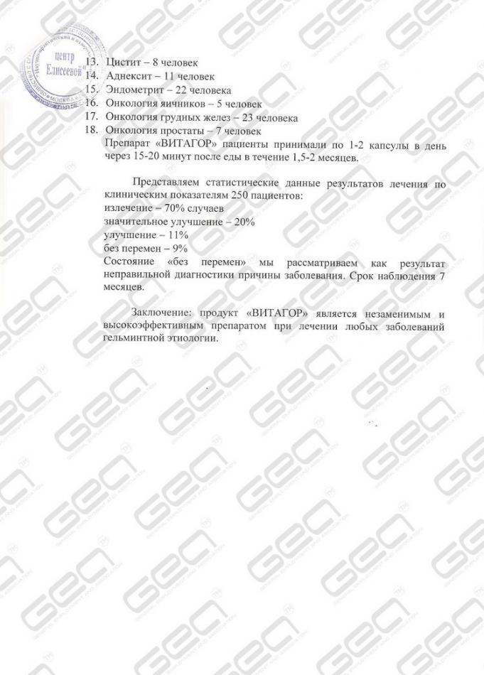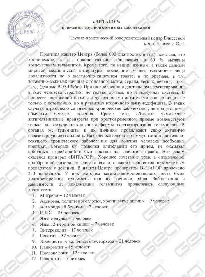 Отзыв научно-практического центра Елисеевой о лечении трудноизлечимых заболеваний препаратом "Витагор":