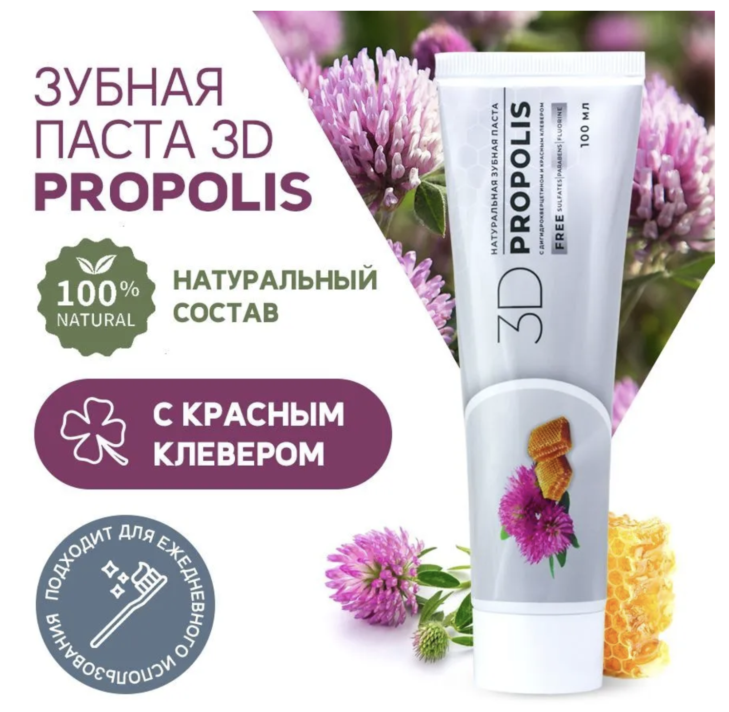 Натуральная зубная паста премиум-класса «3D Propolis» с дигидрокверцетином и красным клевером создана на основе природных растительных и минеральных компонентов с применением передовых технологий и предназначена для комплексного ежедневного ухода за полостью рта. Это действительно оригинальная зубная паста, прекрасный вкус и запах которой, высокое качество, а также привлекательный вид не оставят равнодушными ценителей полезных натуральных продуктов.